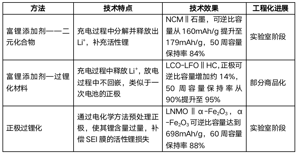 正極預(yù)鋰化是指通過額外添加的活性鋰源,來補償不可逆的活性鋰損失,確保電池內(nèi)活性鋰的充足。相較于流程復(fù)雜?安全風(fēng)險高,且對環(huán)境和工藝要求較高的負極預(yù)鋰化技術(shù),目前研究較多的正極預(yù)鋰化技術(shù)集中在高性價比的富鋰添加劑開發(fā)方面。