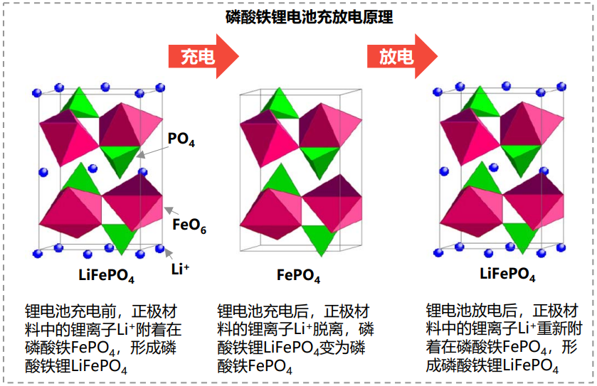 當(dāng)鋰電池放電時(shí),Li+從負(fù)極材料中脫離,穿過電池隔膜和電解液后回到正極材料,F(xiàn)ePO4在Li+嵌入后變回LiFePO4 ,完成放電過程。